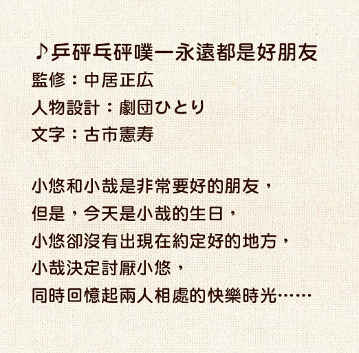 | 兩個主角–小悠與小哉為故事出發點,強調「永遠都是好朋友」。敘述好朋友心情的變化,開始由喜愛轉為討厭的內心戲碼,反覆轉折的從「期待」轉為「冷淡」,進而為「珍惜」,透過繪本的闡述引領孩子們去感受主角們的心情起伏。 |