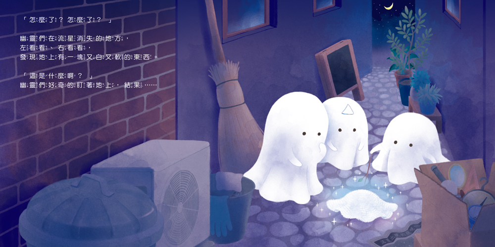 這不是一個嚇人的故事,而是一個讓孩子感覺安心的故事。在一個安靜的夜晚,一顆流星掉落小巷。軟綿綿的小幽靈什麼都不記得,只知道自己很想「回家」。於是他努力學習成為一個「及格」的幽靈——洗臉、練躲貓貓、練嚇人……卻總是不太成功。